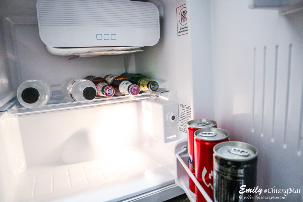 冰箱有放兩瓶罐裝水、需要付費的汽水及酒類